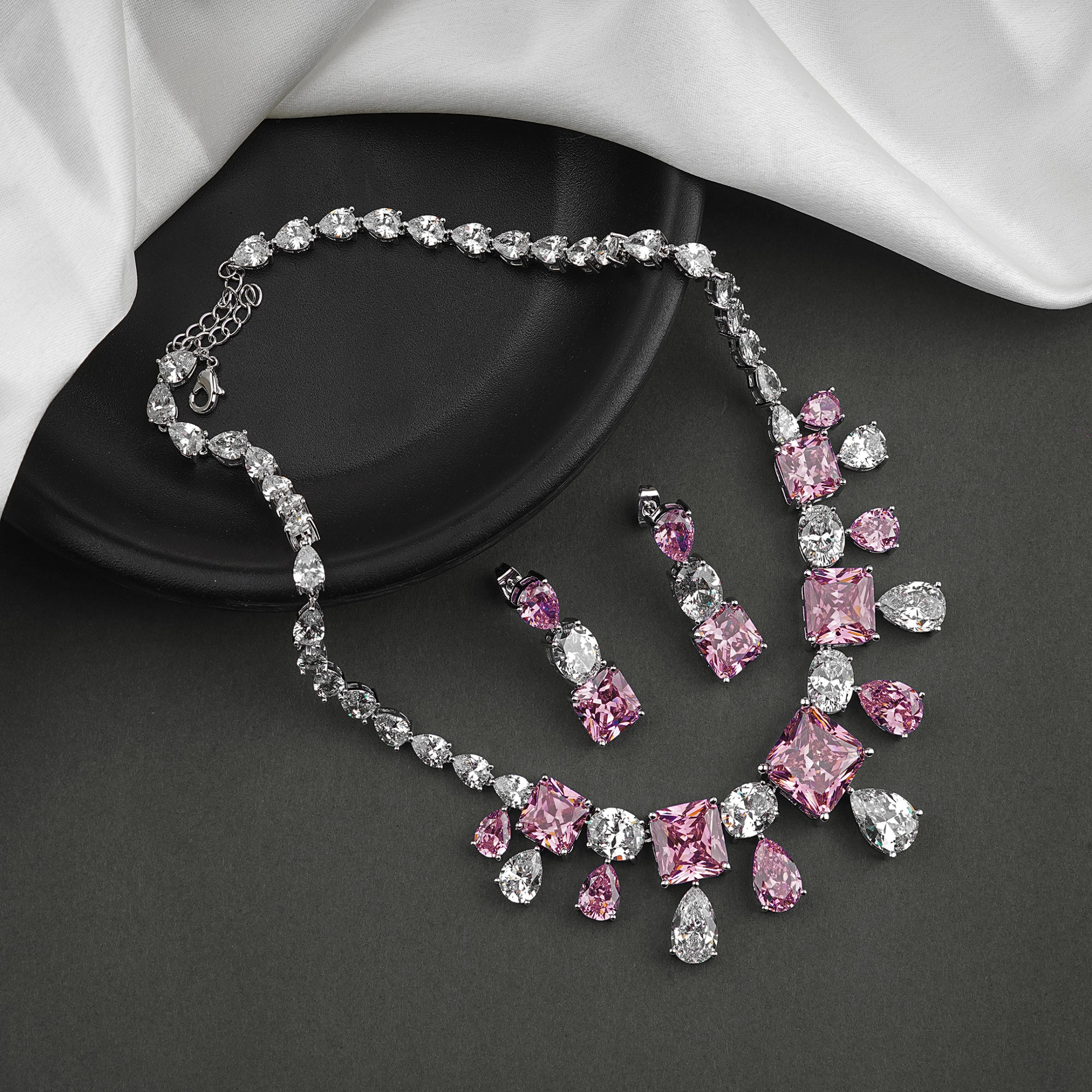 Add a touch of graceful glamour with this stunning necklace and earring set. Featuring brilliant pink and white gemstones, it’s the perfect accessory to make a sophisticated statement....
