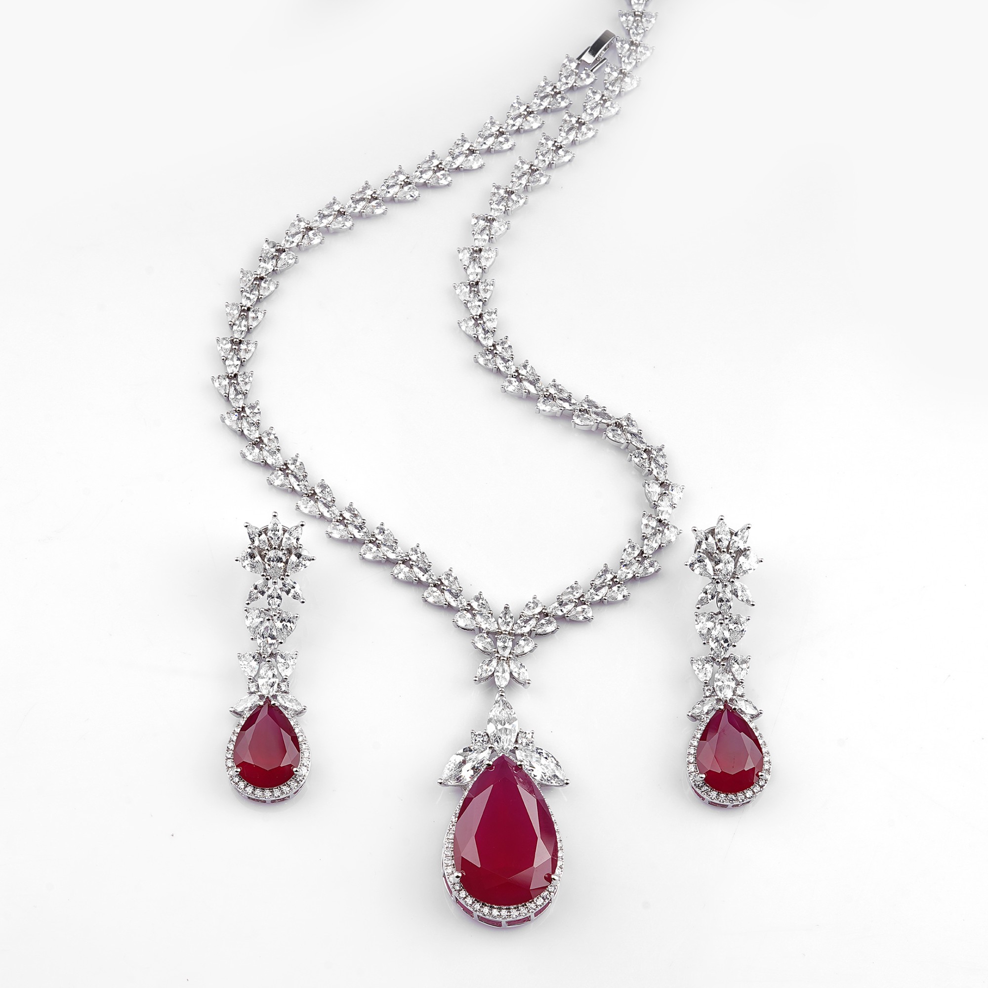 This magnificent jewelry set features a necklace and matching earrings, each showcasing a large, deep red teardrop-shaped stone. The vibrant center stones are surrounded by a brilliant array of marqui...