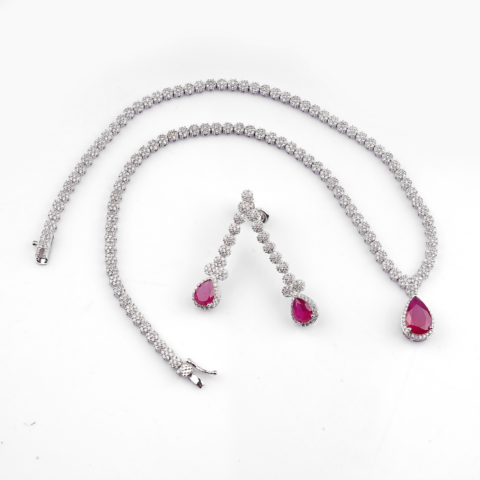 Dazzle with this luxurious jewelry set. It pairs a dazzling diamond tennis necklace with matching drop earrings, each adorned with a vibrant, pear-shaped ruby for a touch of classic glamour....