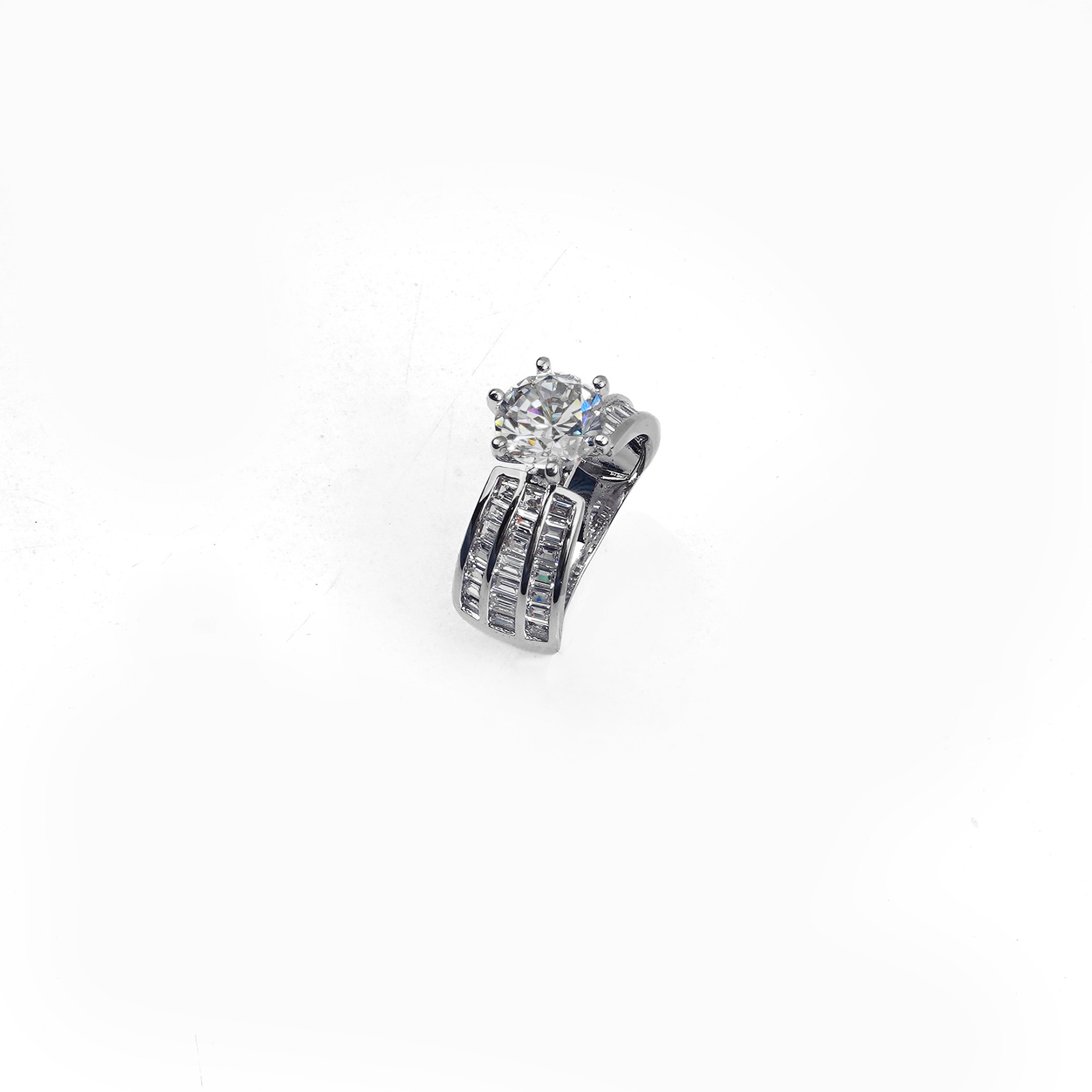 This stunning solitaire ring features a brilliant, round cubic zirconia stone at its center. The elegant silver-tone band is adorned with two rows of sparkling emerald-cut cubic zirconia stones on eac...