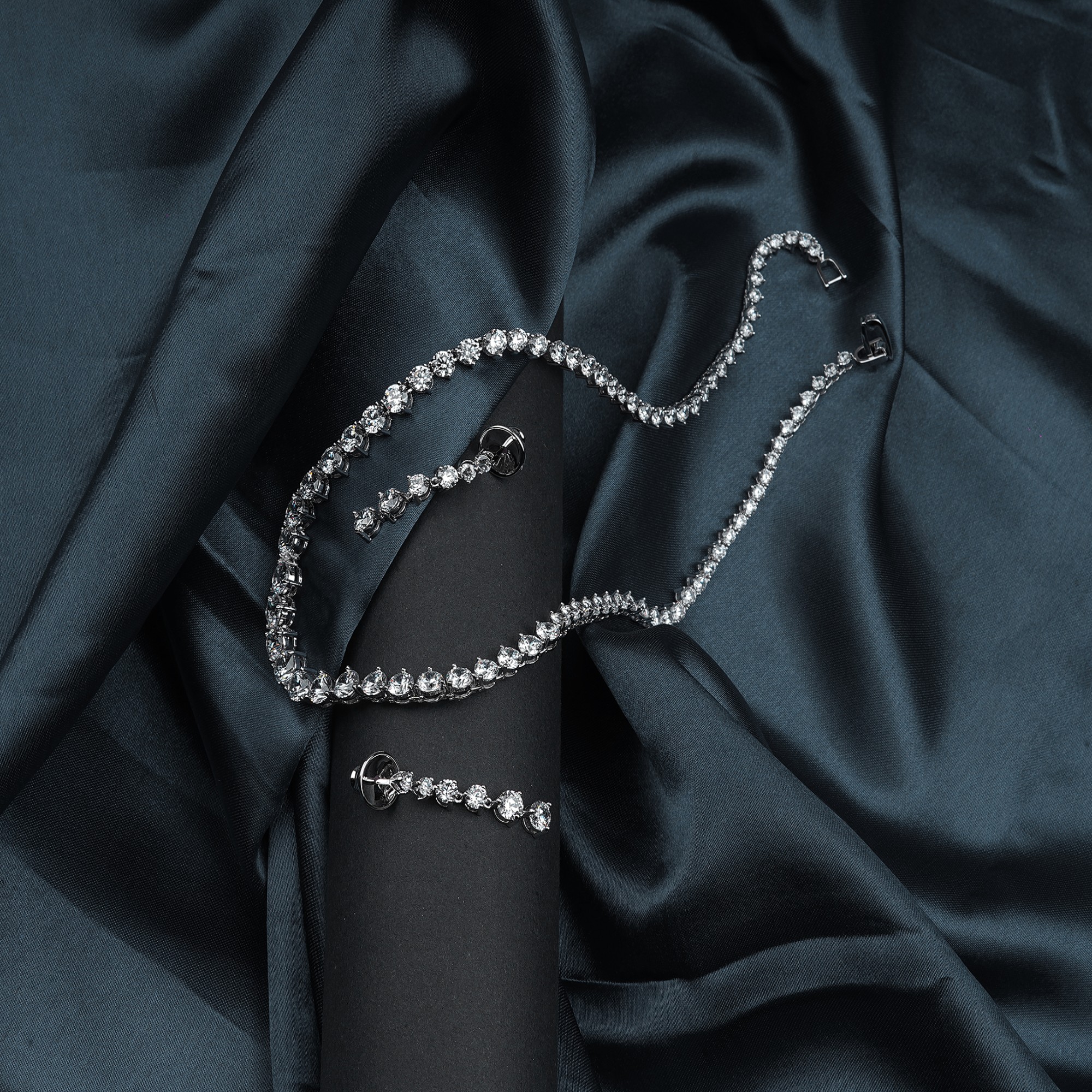 This exquisite set features a classic tennis necklace and matching linear earrings. Adorned with brilliant, clear stones, this set adds a touch of timeless elegance and sparkle to any outfit....