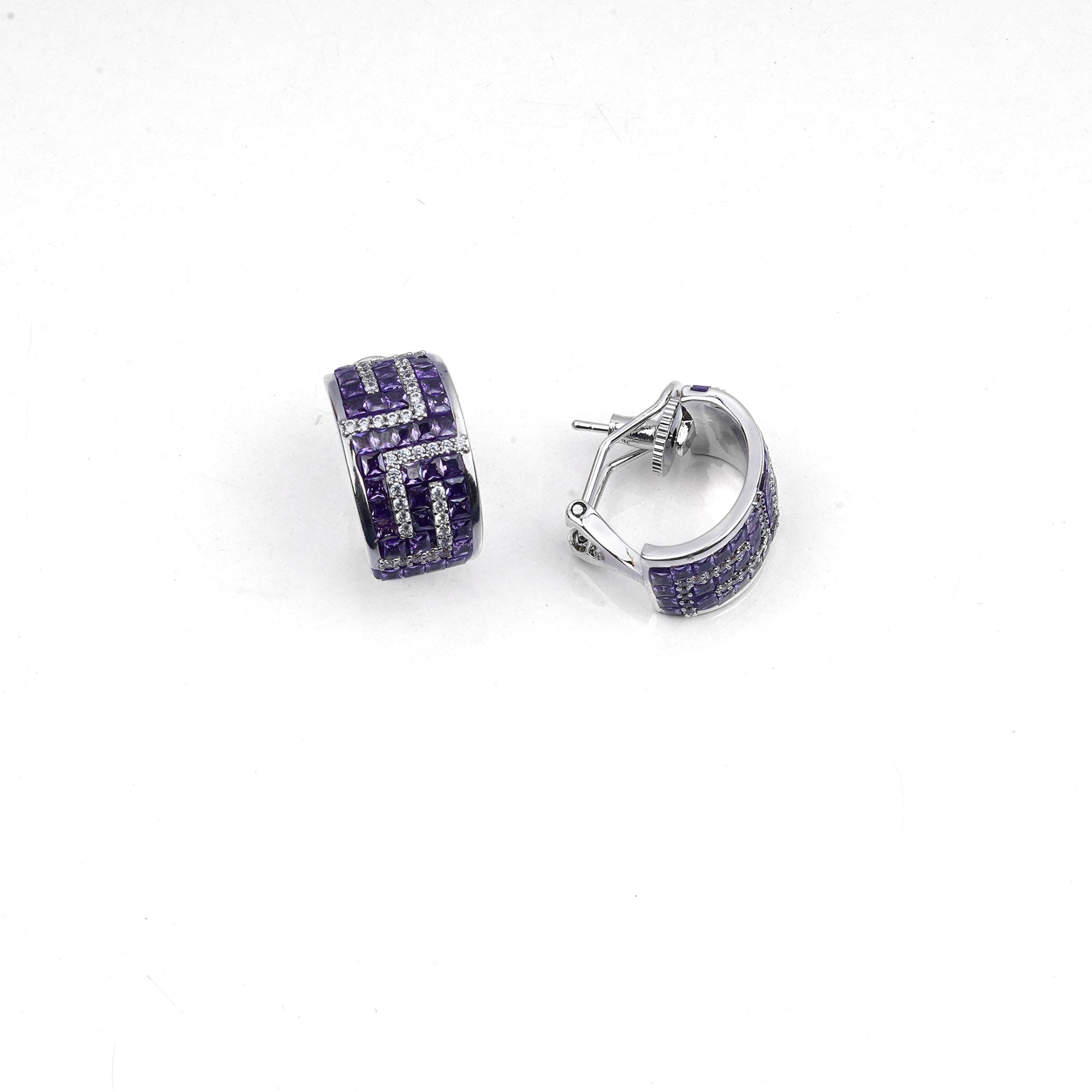 Elegant, silver-toned clip-on earrings featuring a bold, wide design. They are richly detailed with a unique maze-like pattern of deep amethyst-purple and sparkling white crystals, creating a sophisti...