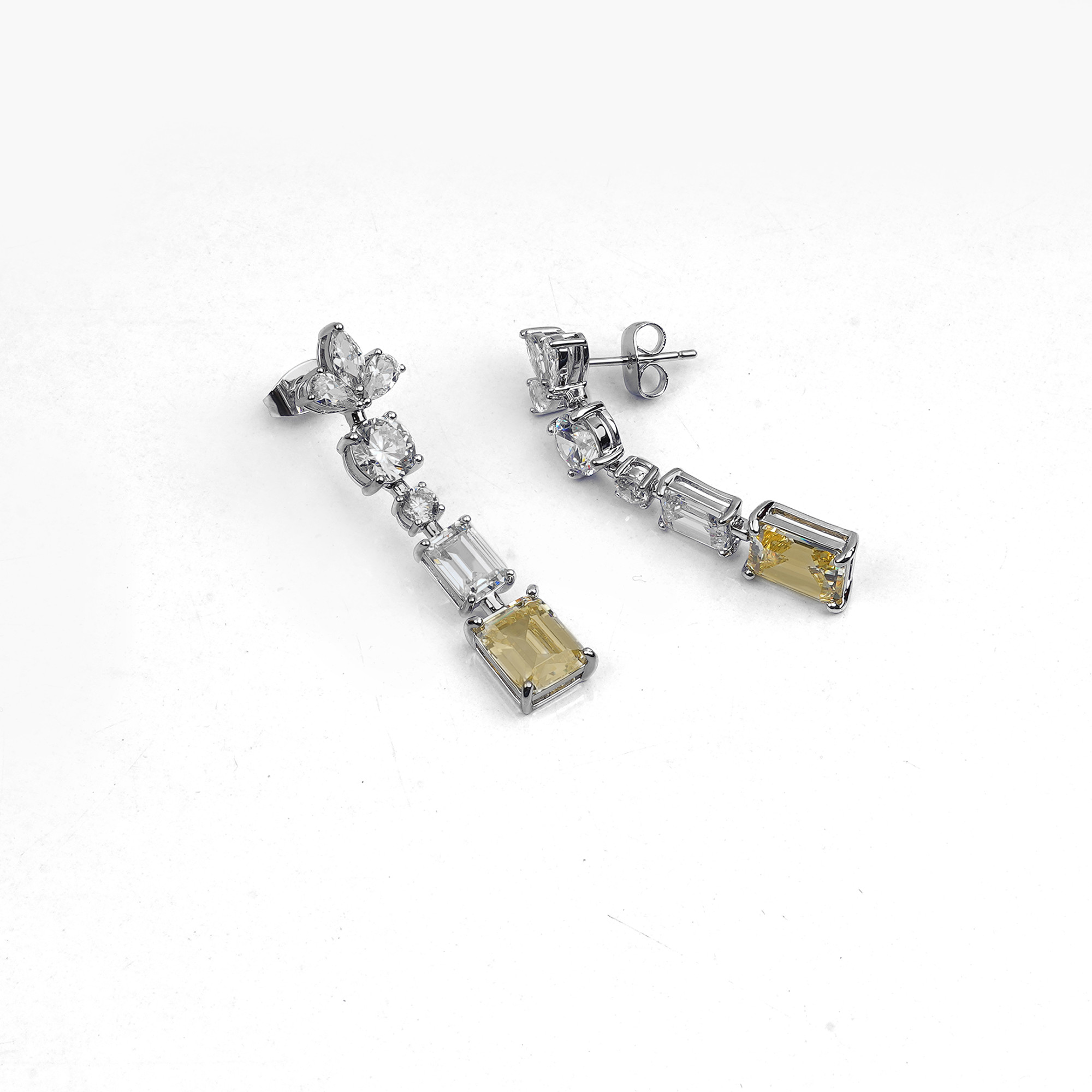 Elegant rhodium-plated dangle earrings with a modern, linear design. They feature a brilliant canary yellow rectangular-cut cubic zirconia stone at the bottom, joined by clear baguette and round-cut c...