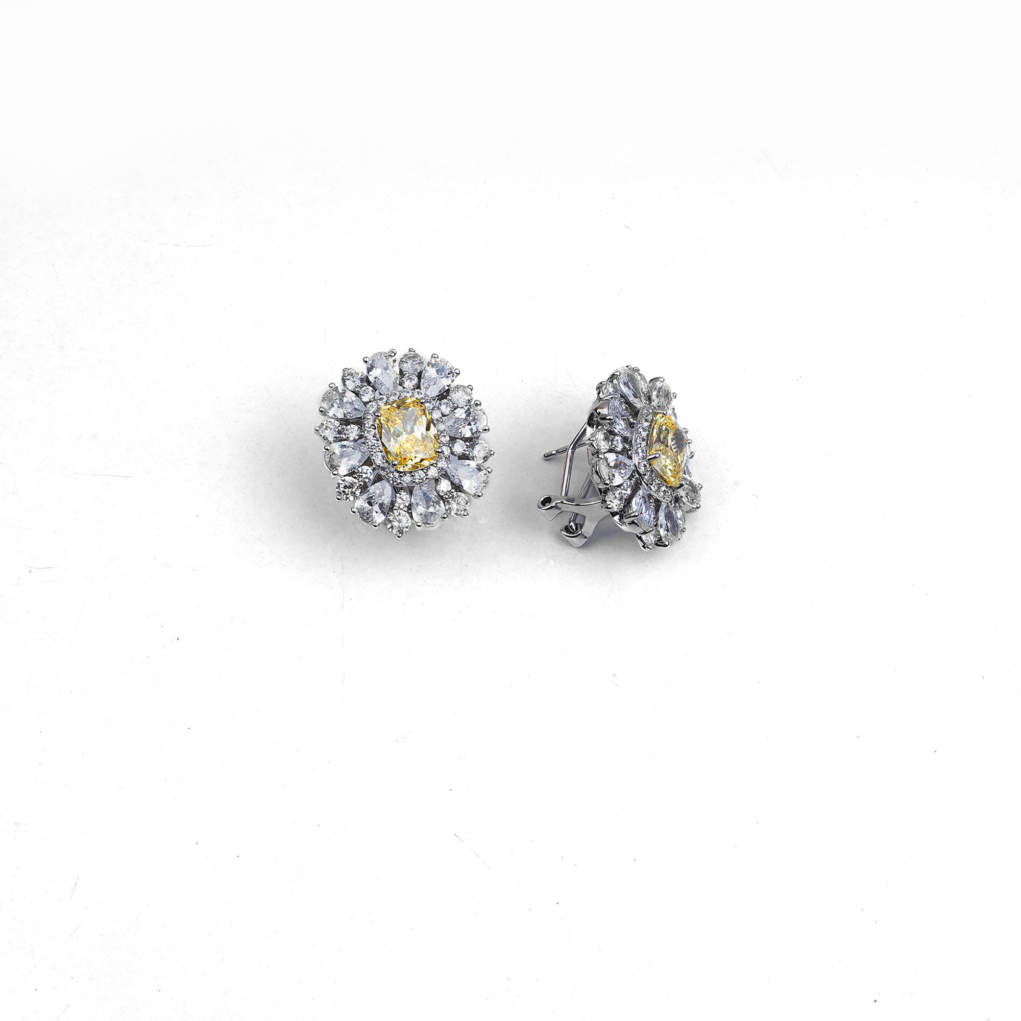 Dazzling rhodium-plated stud earrings featuring a radiant square-cut canary yellow cubic zirconia stone at the center. The bright stone is surrounded by a brilliant, multi-crystal floral cluster of cl...