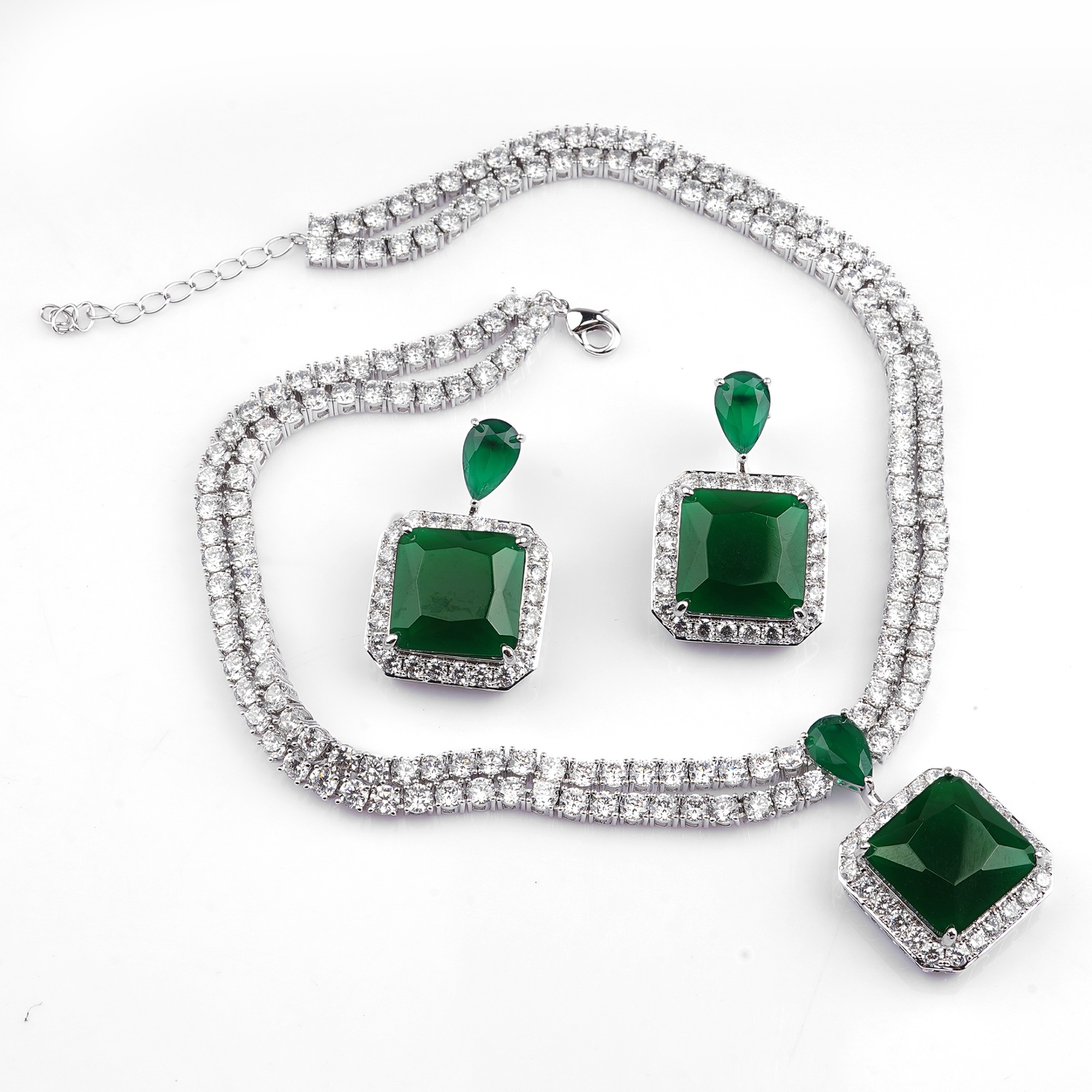 Adorn yourself in timeless elegance with the "Emerald Radiance" jewelry set. This striking collection features a stunning necklace and earring pair, each showcasing a brilliant, emerald-hued square ge...