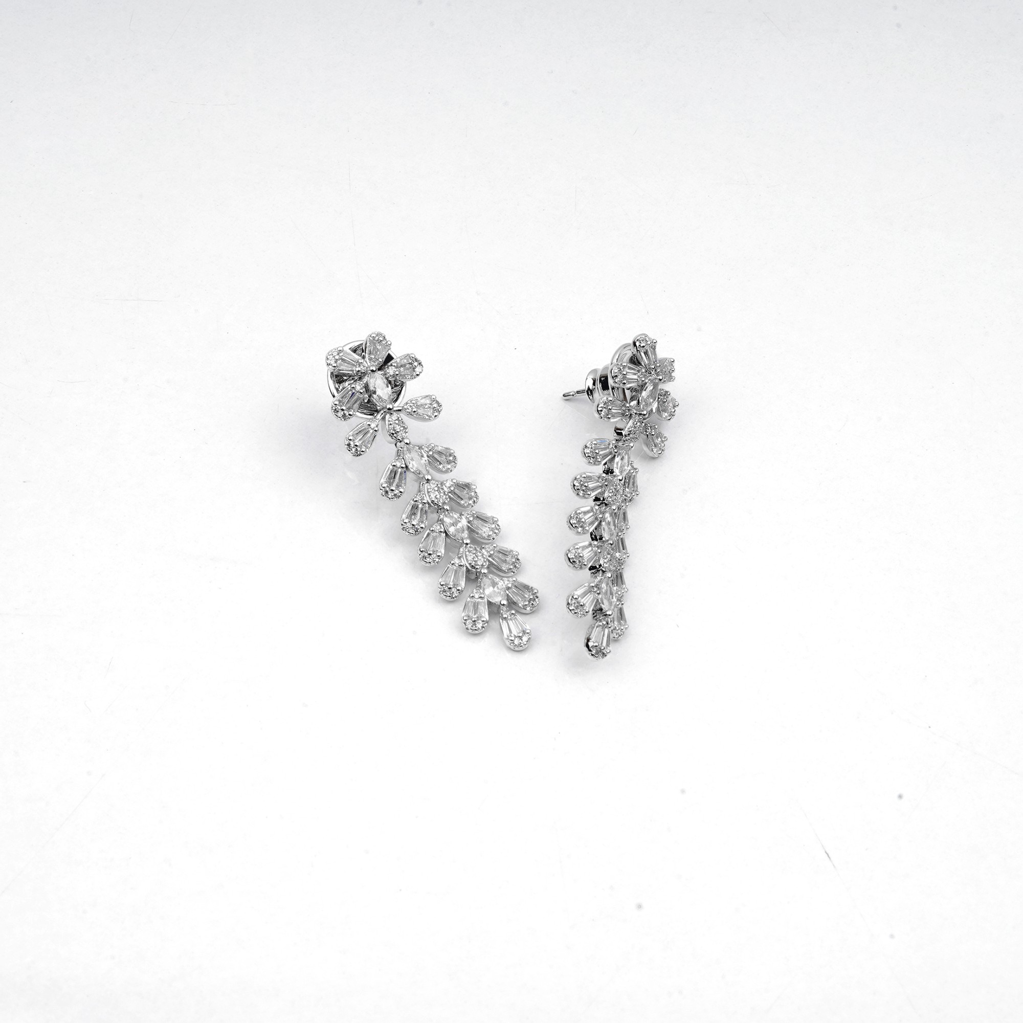 Elegant, silver-toned drop earrings that cascade like sparkling vines. Each earring features a delicate floral stud from which a stream of brilliant baguette and round-cut crystals flows, creating a s...