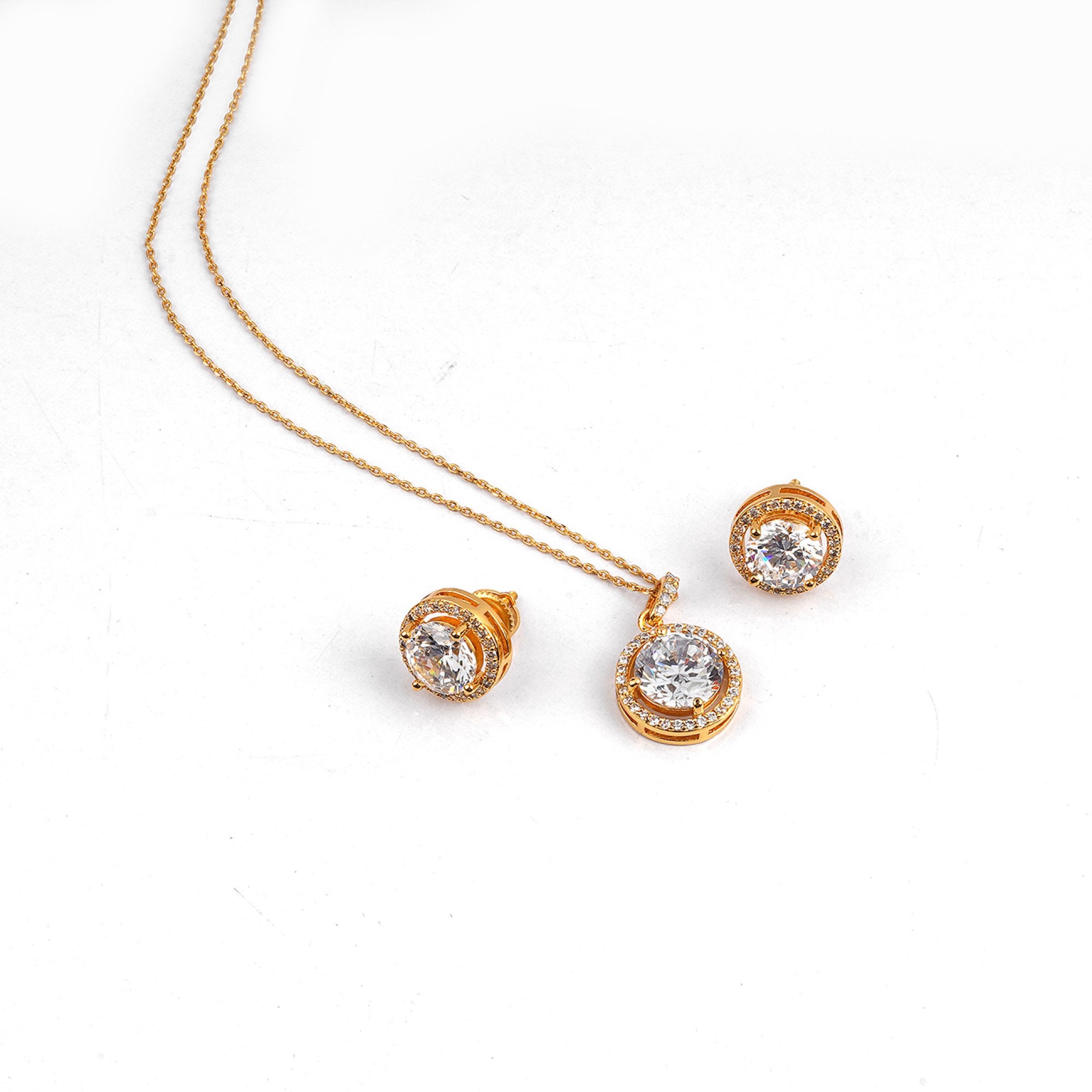 This elegant three-piece set features a necklace and matching stud earrings, each with a brilliant round cubic zirconia stone at its center. A sparkling halo of smaller stones surrounds the main gem, ...