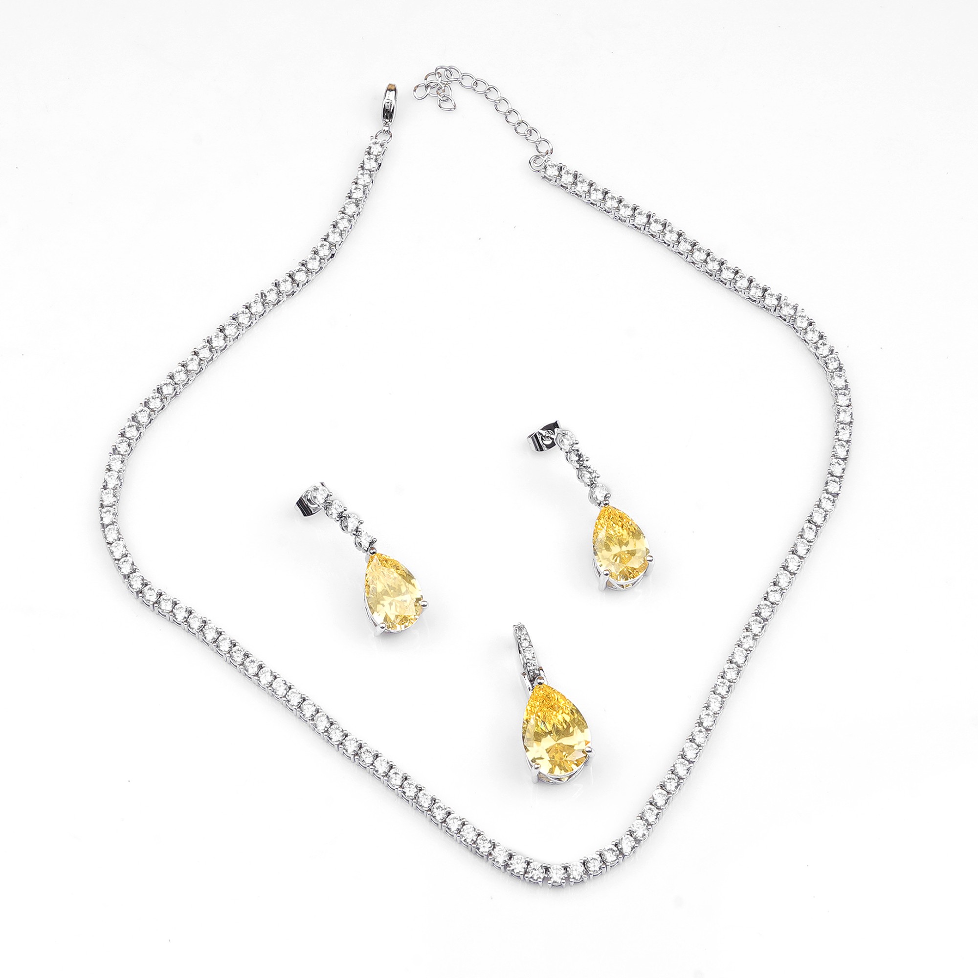 Adorn yourself in timeless elegance with the "Golden Dewdrop" jewelry set. This beautiful collection features a delicate chain of brilliant white gems, leading to a stunning teardrop-shaped centerpiec...