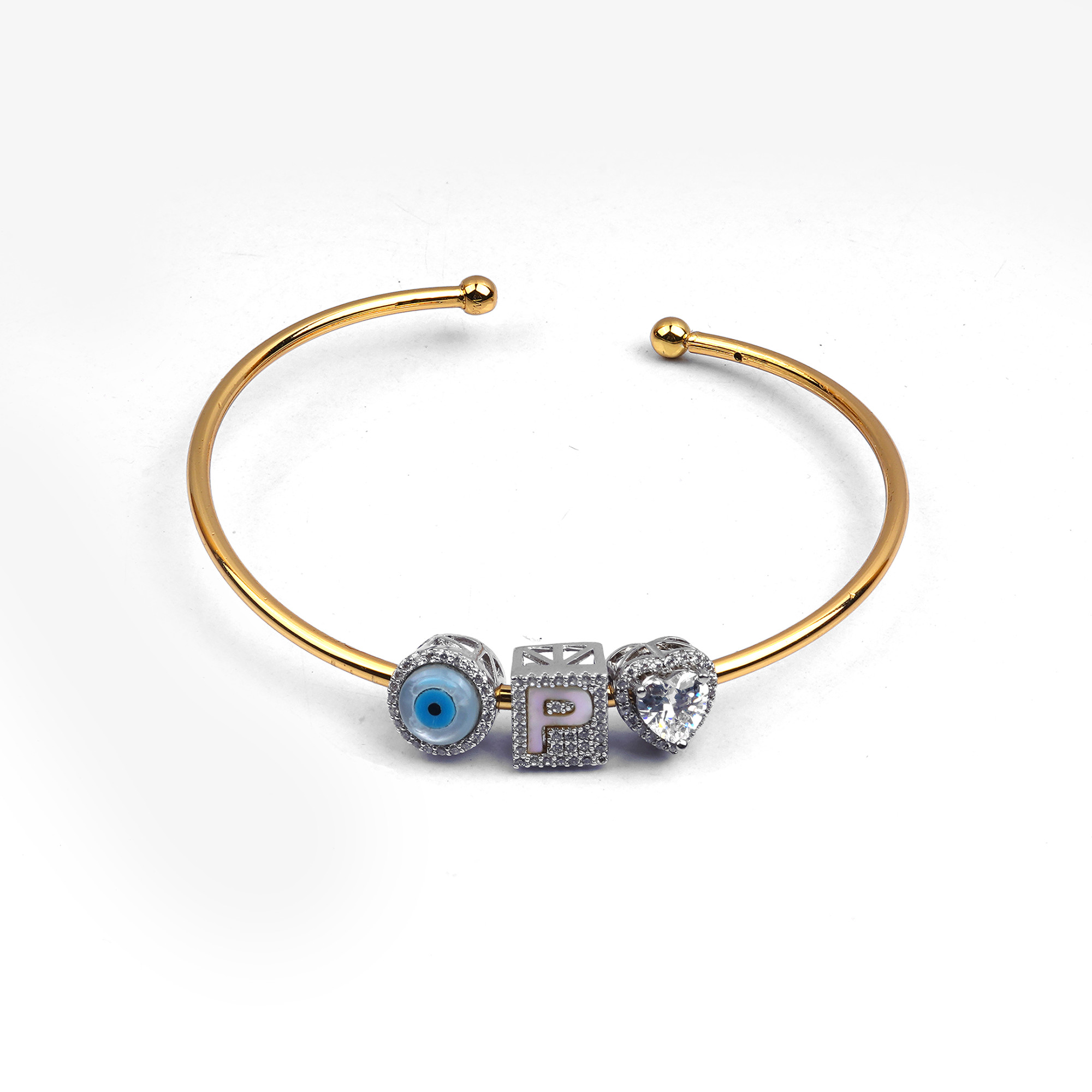 A gorgeous gold-toned open cuff bracelet featuring three interchangeable slider charms: a protective Evil Eye bead, a sparkling Pave Letter 'P' (or custom initial) on a pink enamel base, and a brillia...