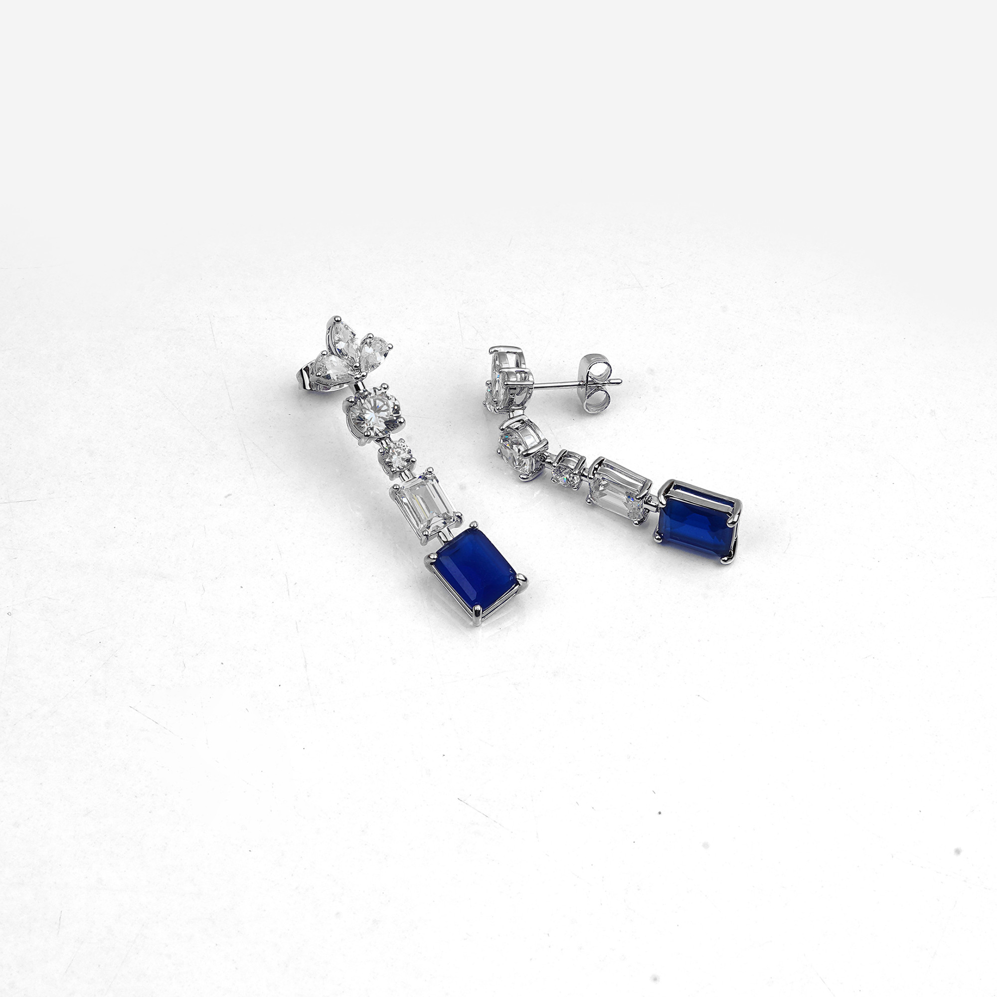Elegant rhodium-plated dangle earrings with a sophisticated, linear design. They feature a brilliant sapphire blue rectangular-cut cubic zirconia stone at the base, connected by a sequence of sparklin...
