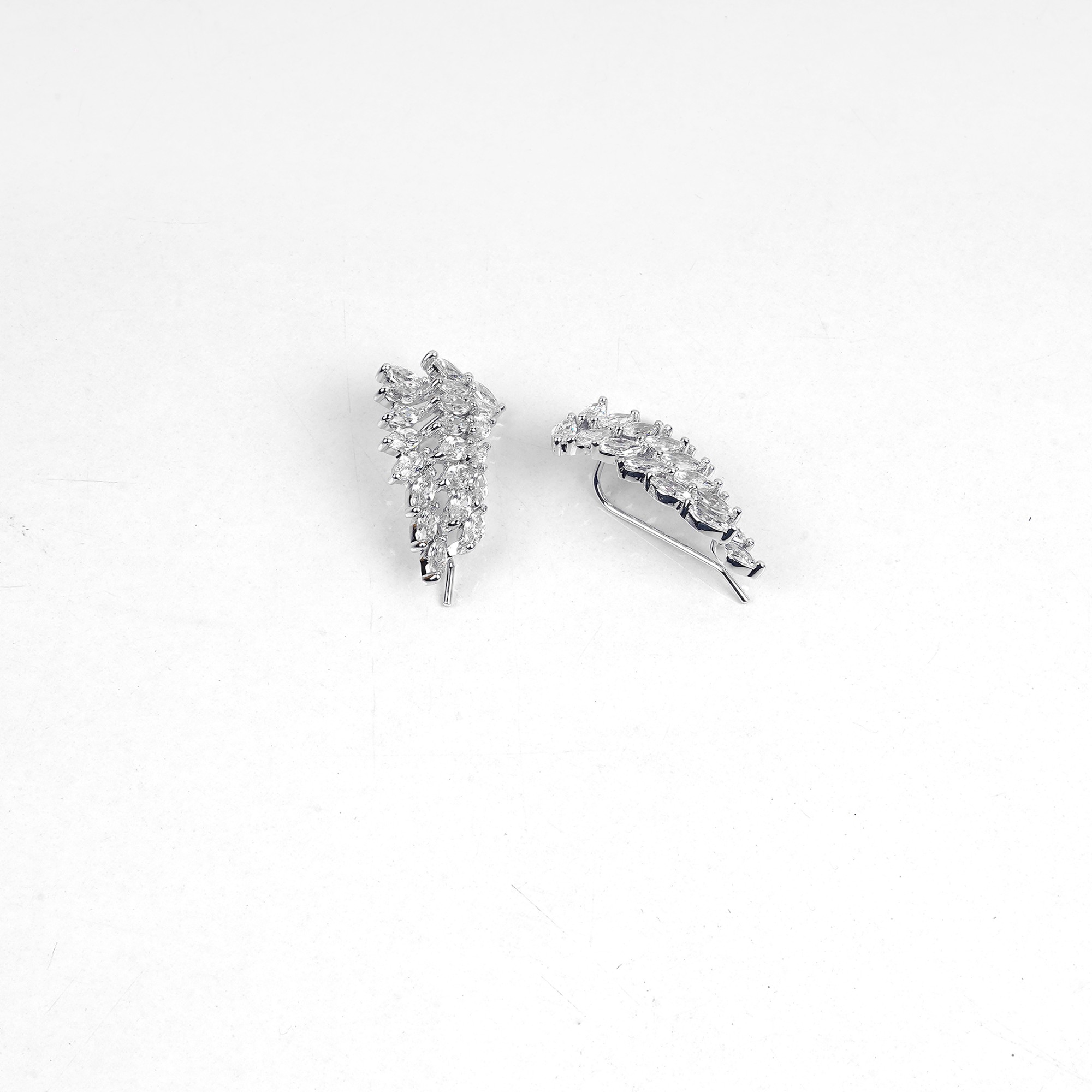 Elegant, silver-toned ear climber earrings with a unique and graceful design. A trail of sparkling marquise-cut crystals is meticulously arranged to resemble a luminous feather, creating a stunning an...