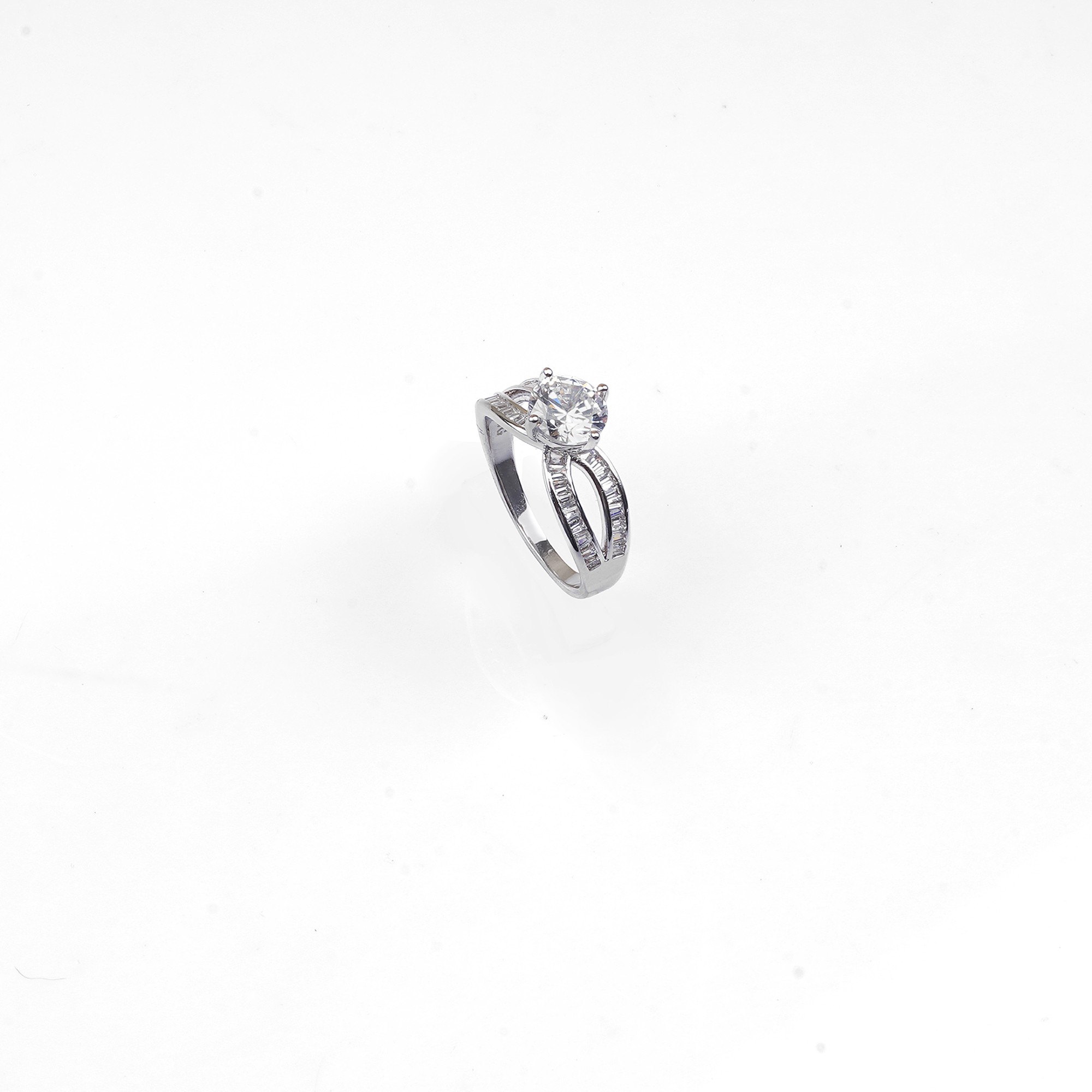 This elegant solitaire ring features a brilliant, round cubic zirconia stone set in a modern split-shank band. The silver-tone band is adorned with sparkling baguette-cut cubic zirconia stones, creati...