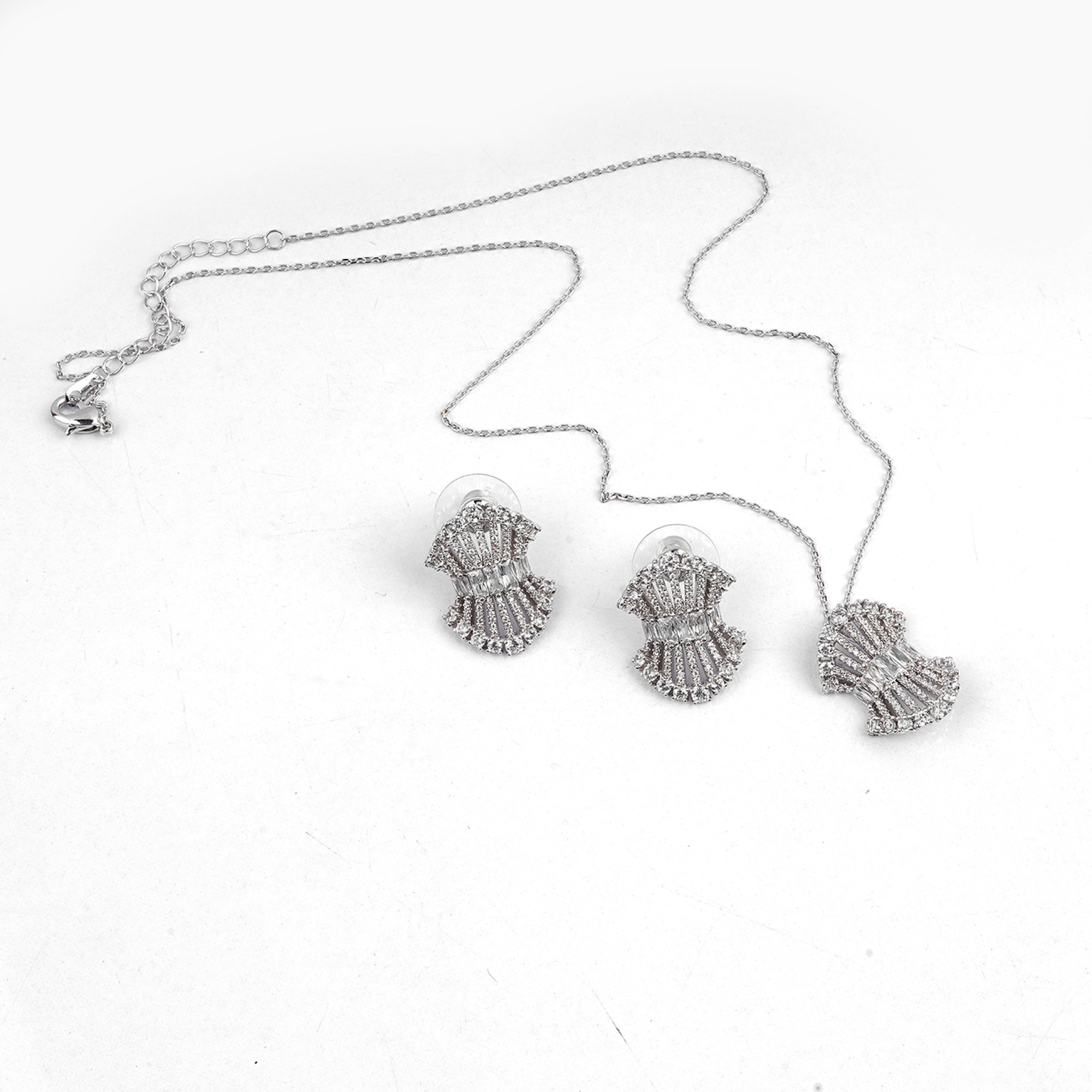 This stunning three-piece set features a necklace and matching earrings, all with a brilliant silver-tone finish. Each piece showcases a unique tassel design, intricately adorned with sparkling cubic ...