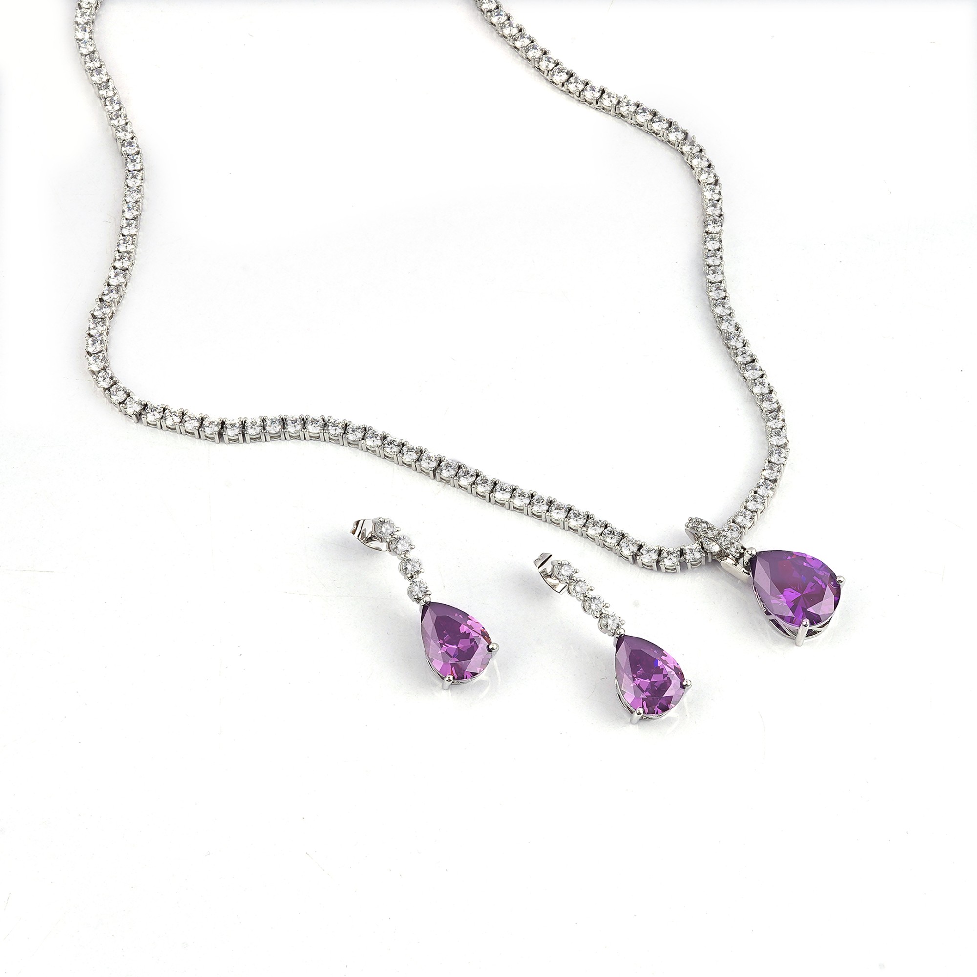 A classic and elegant jewelry set featuring a delicate tennis necklace and matching drop earrings. Each piece is beautifully accented with a stunning lavender teardrop stone, creating a bold and sophi...