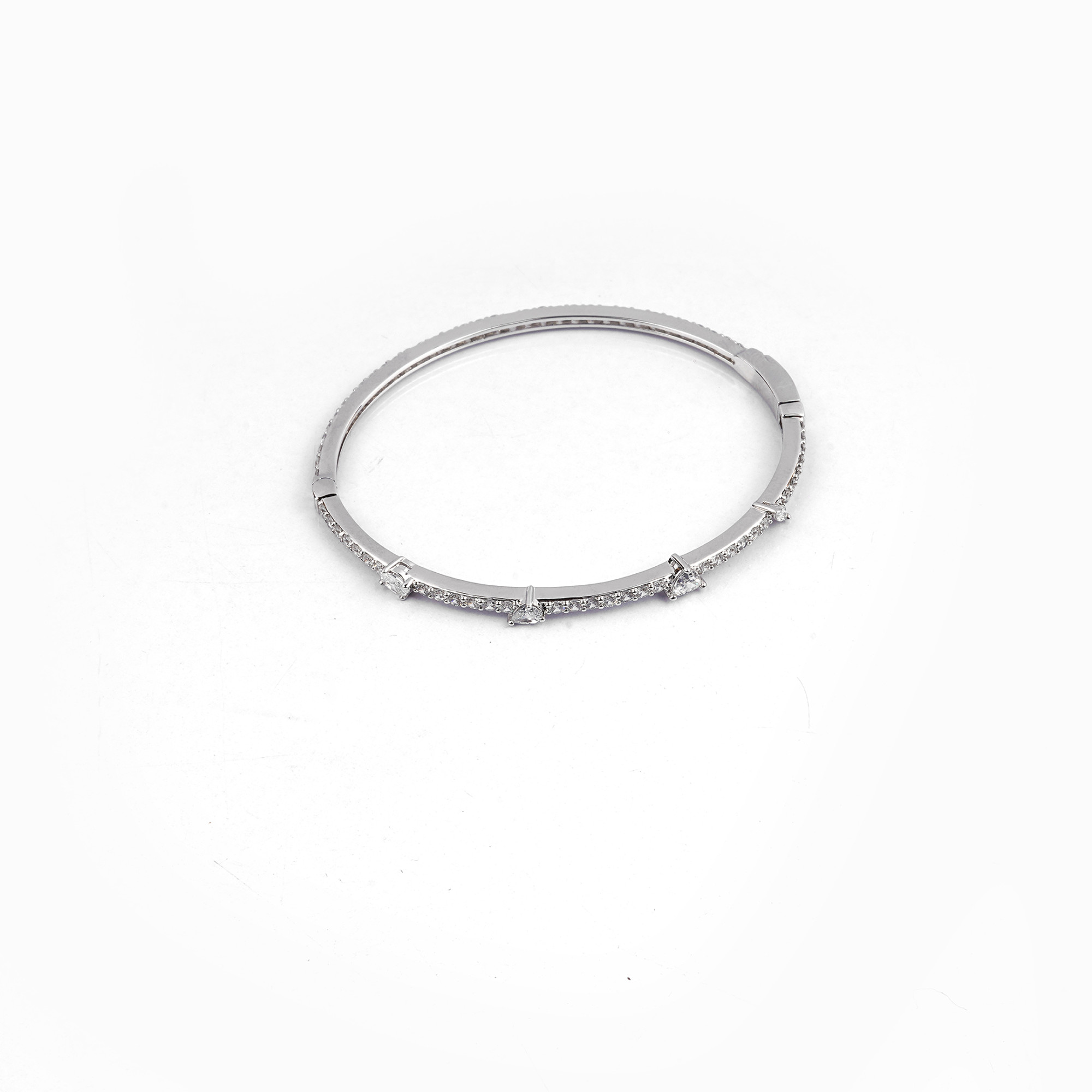 A delicate and dazzling rhodium-plated bangle designed to catch the light from every angle. It features a continuous band of brilliant micro-pave stones, elegantly interrupted by four larger, geometri...
