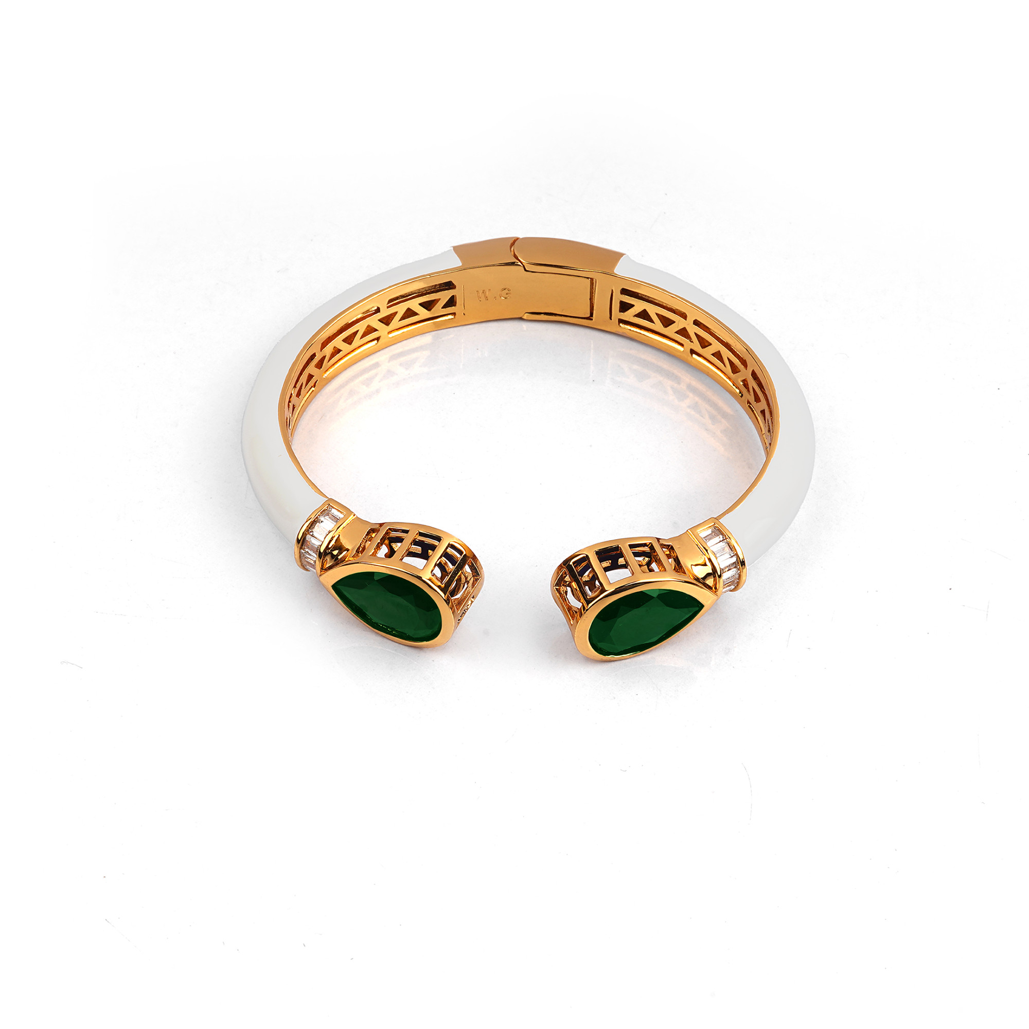 A sophisticated open cuff bangle that epitomizes modern luxury. It features a bold, polished white enamel band set against a gold-tone lattice framework. The design culminates in striking, teardrop-sh...