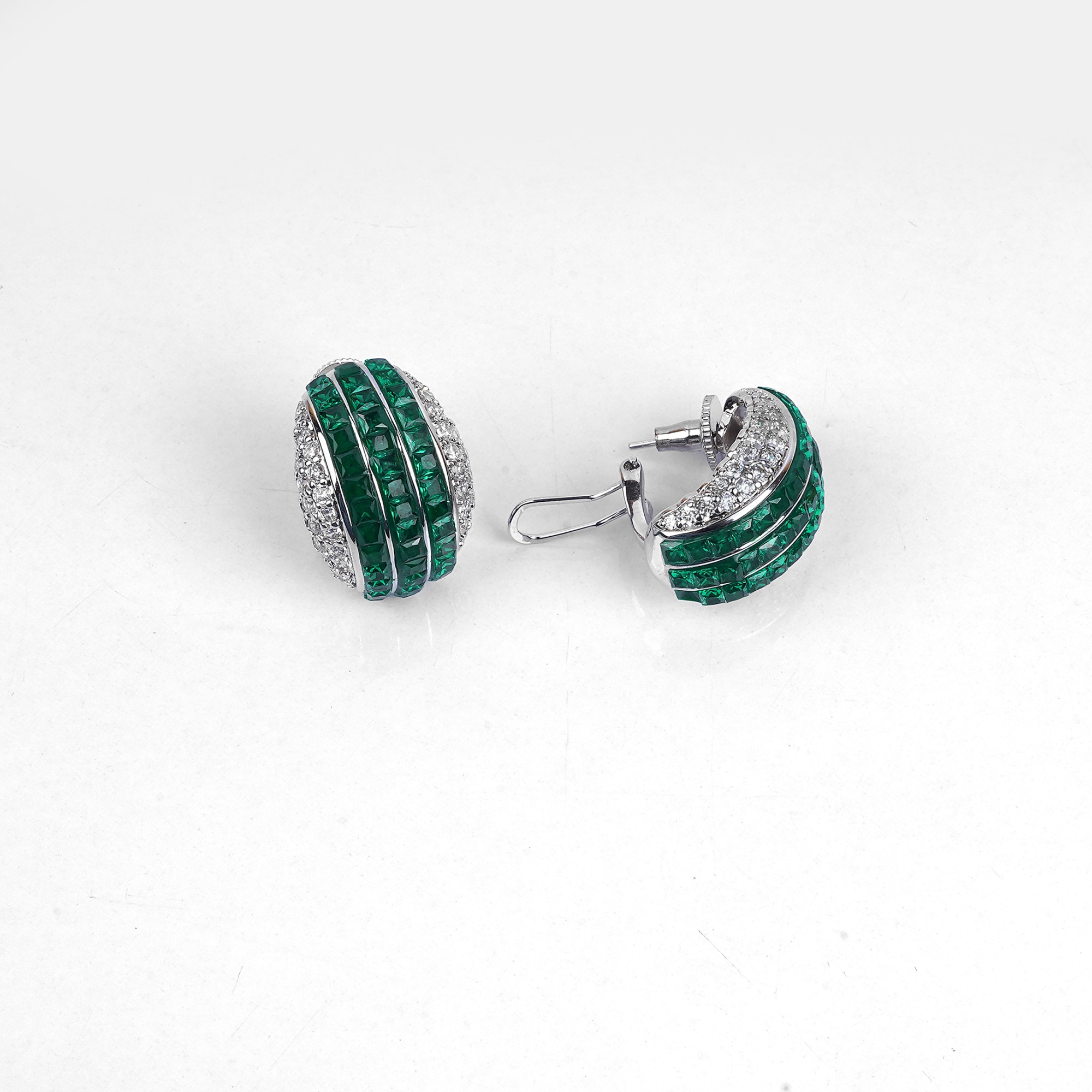 These stunning earrings feature two parallel rows of deep green stones set in a sparkling pavé style, framed by brilliant white cubic zirconia. Their elegant, curved design adds a rich pop of color a...