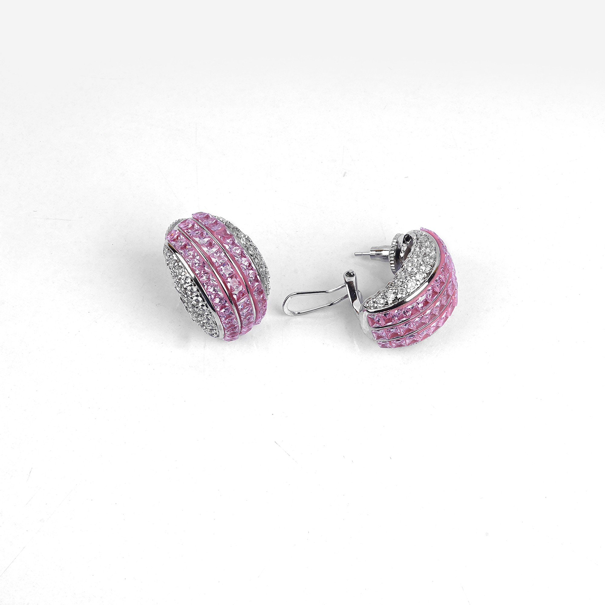 These chic earrings feature two rows of shimmering pink stones set in a delicate pavé design, framed by a border of brilliant white cubic zirconia. Their elegant, curved shape adds a touch of modern ...