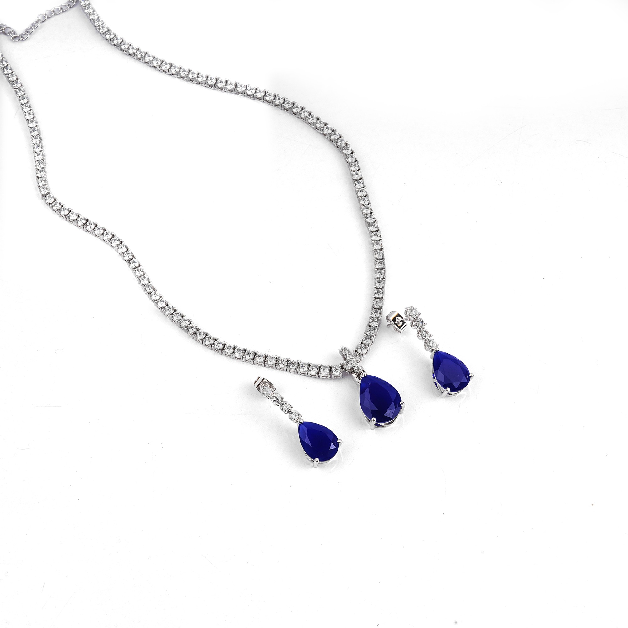 A classic jewelry set featuring a brilliant tennis necklace and matching drop earrings. This set is beautifully crafted with a deep sapphire-blue teardrop stone, creating a sophisticated and timeless ...